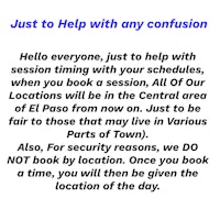 NOTE: We ONLY ACCEPT TEXAS BOOKINGS, so even though you may contact us from another State initially, NO BOOKING IS EVER FINALIZED UNTIL YOU CROSS THE STATE LINE INTO TEXAS. Once you cross the State Line into Texas, THIS IS ONLY WHEN YOUR Booking for A Session IS FINALLY 100%